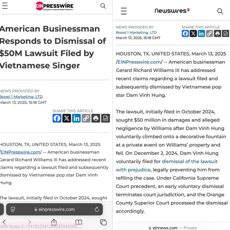 News Wires đăng tải vụ kiện triệu đô của ca sĩ Đàm Vĩnh Hưng và ông Gerard Williams