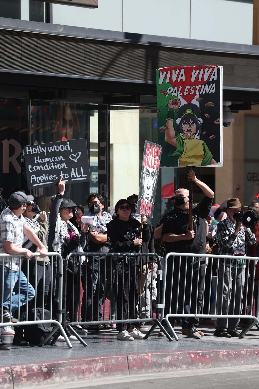 Theo Page Six, nhóm người biểu tình ủng hộ Palestine đứng phía ngoài rào chắn tại Đại lộ Hollywood với những tấm biển có dòng chữ "Những người hùng chiến đấu như người Palestine".