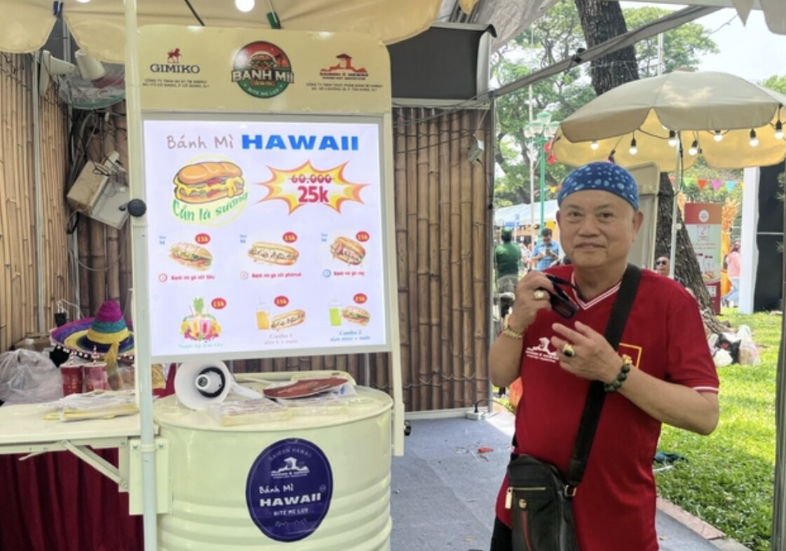 Ông Vương Hoàng Minh, chủ gian hàng Bánh mì Hawaii, là một Việt kiều Mỹ, đã bước vào tuổi U70. Từ từ lấy ổ bánh mì còn nóng trong thùng phuy, ông vui vẻ giới thiệu: "Toàn bộ bánh nhân thịt gà kèm các loại xốt nhập trực tiếp từ Mỹ về. Vùng đất Hawaii nổi tiếng với các món từ thịt gà cũng là đặc trưng của thương hiệu này khi về Việt Nam.