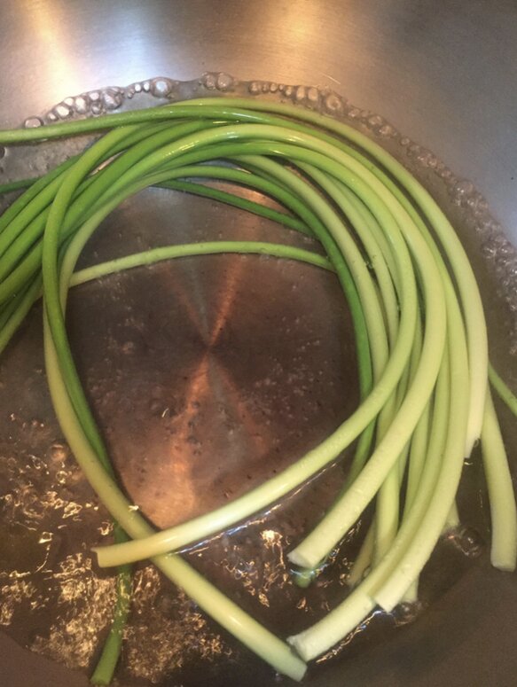 Bước 1: Rửa sạch ngồng tỏi, cắt phần đầu và gốc già. Đặt nồi nước lên bếp, đun sôi thì cho vài giọt dầu ăn vào. Sau đó cho ngồng tỏi vào chần sơ. Sau khi thấy ngồng tỏi chuyển màu thì bạn vớt ra, thả vào chậu nước lạnh để giữ độ giòn và màu xanh.