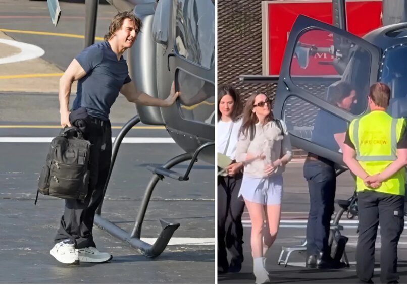 Bước xuống bãi đáp, Tom Cruise và Ana de Armas thân thiện trò chuyện với nhóm nhân viên an ninh, kỹ thuật. Đây là lần thứ hai cả hai được bắt gặp di chuyển chung bằng máy bay trực thăng, hồi tháng 3 họ cũng tới London bằng phương tiện này.