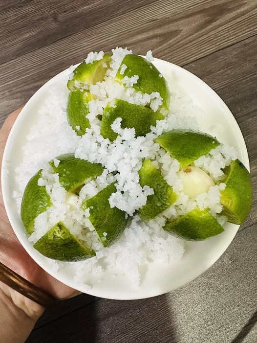 • Rắc muối hột vào các khe cắt trên quả chanh.