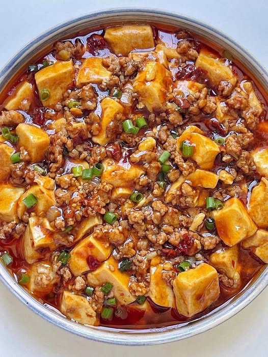 3. Đun nóng dầu trong chảo, cho hành và đậu tương vào xào thơm lên rồi cho thịt băm vào xào. Xào đến khi thịt băm đã chín thì mình cho đậu phụ non vào và đổ bát nước sốt vừa pha vào
