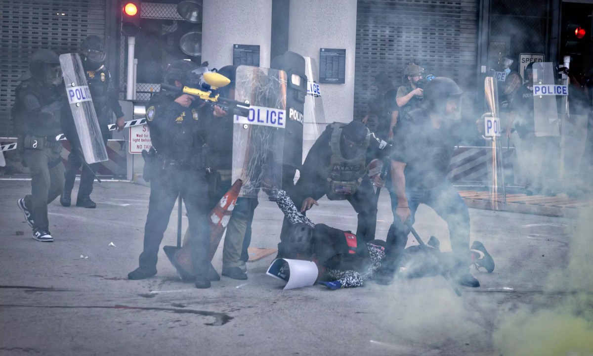 Lực lượng cảnh sát của Bộ An ninh Nội địa Mỹ bắt một người biểu tình bên ngoài trung tâm giam giữ liên bang ở Los Angeles.