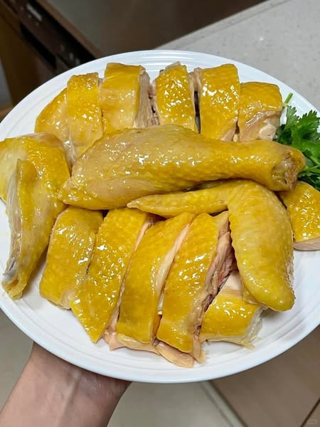 - Bày gà ra đĩa, có thể rưới thêm ít mỡ gà + nghệ phi (tùy thích) để da bóng và thơm.