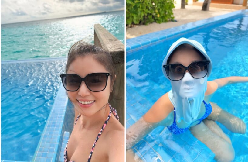 Trong một bức ảnh, Lâm Tâm Như ngâm mình dưới nước với bộ bikini xanh. Tuy nhiên, cô đội mũ chống nắng che gần hết mặt. Bài đăng thu hút hàng ngàn lượt thích và bình luận.