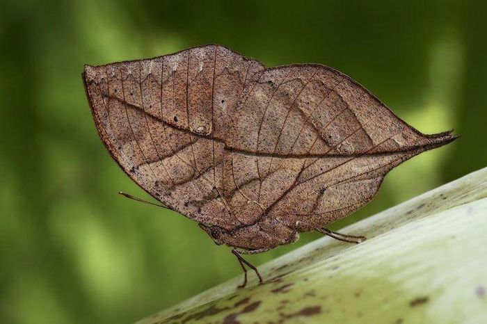 1. Cánh dưới giống hệt lá khô. Khi khép cánh lại, bướm lá khô trông như một chiếc lá khô với đầy đủ đường gân, vết rách và đốm nâu – khiến kẻ săn mồi gần như không thể phát hiện.
