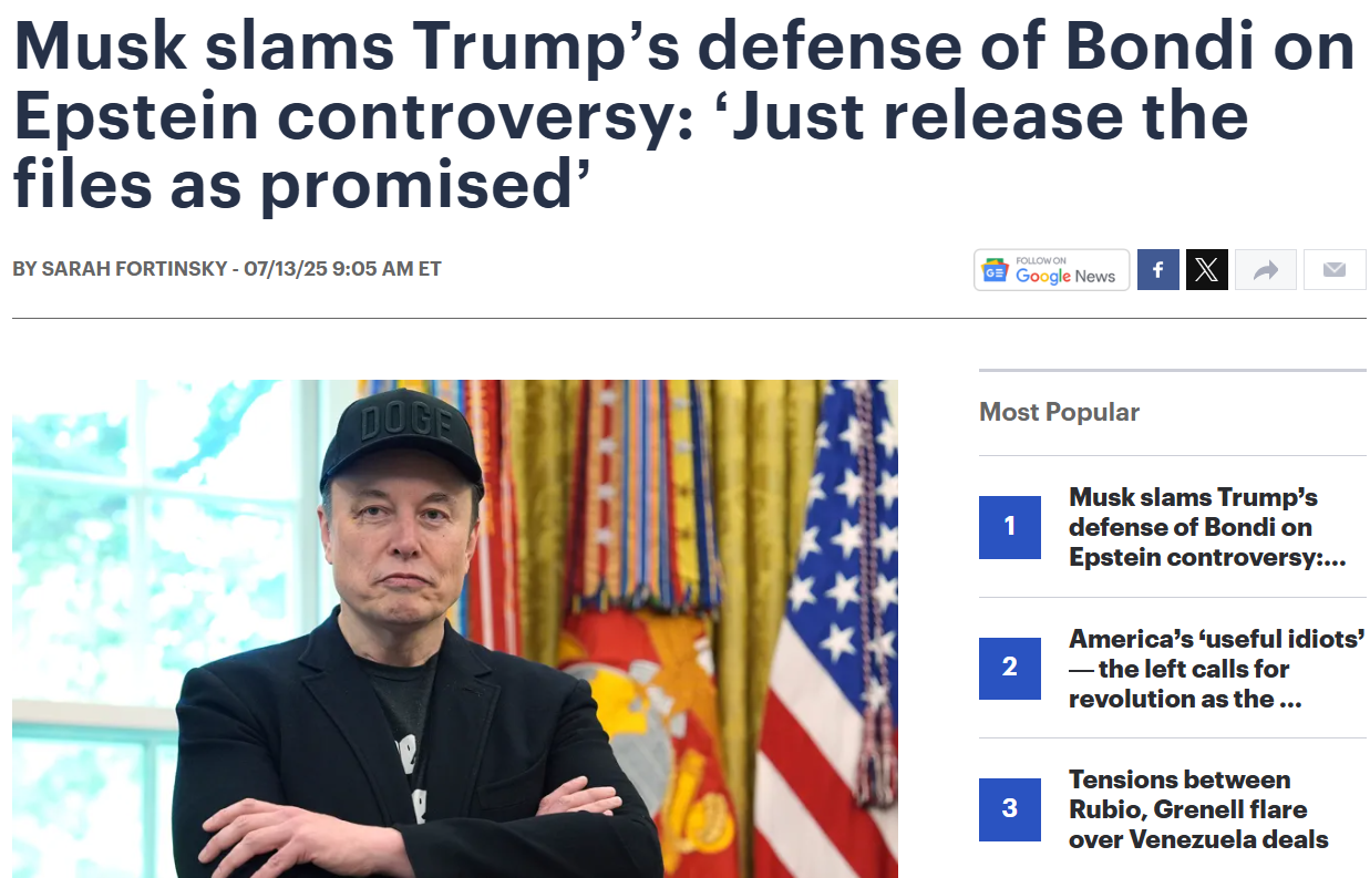 Tỷ phú công nghệ Elon Musk đã chỉ trích Tổng thống Trump hôm thứ Bảy về việc ông bảo vệ Bộ trưởng Tư pháp Pam Bondi và cách bà xử lý vụ án liên quan đến nhà tài chính tai tiếng Jeffrey Epstein.