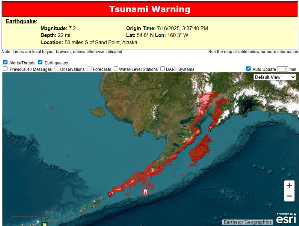 Cảnh báo sóng thần sau động đất ở Alaska. Ảnh: Esri