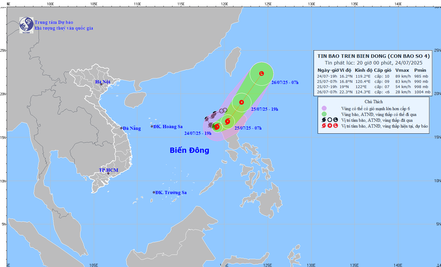 Theo Trung tâm Dự báo khí tượng thủy văn quốc gia, đến 19h tối nay (24/7), vị trí tâm bão số 4 Cỏ May ở vào khoảng 16,2 độ Vĩ Bắc; 119,2 độ Kinh Đông, trên vùng biển phía Đông của khu vực Bắc Biển Đông. Sức gió mạnh nhất vùng gần tâm bão mạnh cấp 10 (89-102km/giờ), giật cấp 12; di chuyển theo hướng Đông Đông Nam với tốc độ khoảng 10km/h.