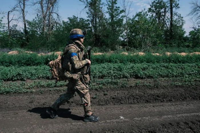 Borys “Forseti”, một lính điều khiển UAV thuộc Lữ đoàn Liubart (Ukraine) đang di chuyển đến các vị trí gần Kostiantynivka (tỉnh Donetsk) ngày 5-7. Ảnh: Francis Farrell/The Kyiv Independent