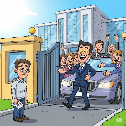 Vừa nói xong, một chiếc xe sang trờ tới. Một người bước xuống, ăn mặc bảnh bao, nói năng phét lác. Ai cũng cười, cũng gật, cũng mời vào như khách quý.