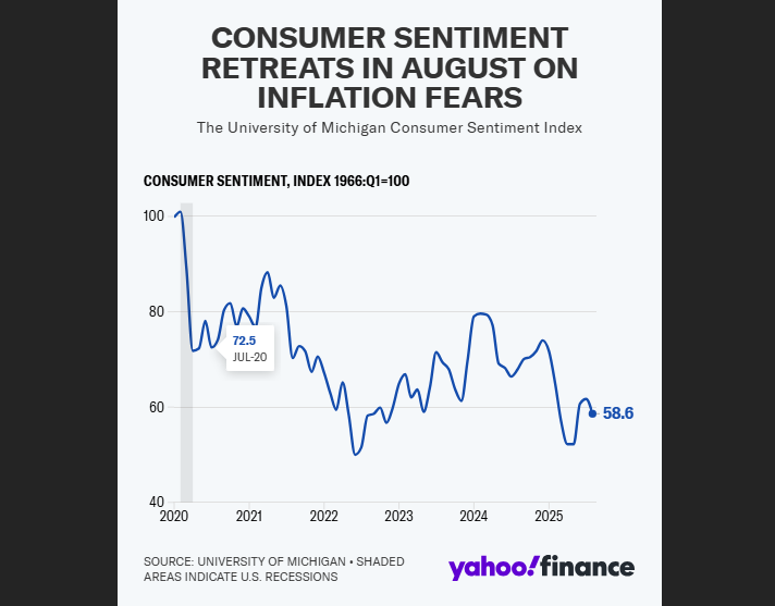 Hôm thứ Sáu, khảo sát tâm lý người tiêu dùng của Đại học Michigan cho thấy tâm lý trong tháng 8 đã giảm gần 6% so với tháng 7 và hơn 14% so với cùng kỳ năm ngoái. Kỳ vọng lạm phát cho năm tới đã tăng từ 4,5% lên 4,8%, trong khi điều kiện mua sắm hàng hóa lâu bền giảm xuống mức thấp nhất trong một năm.