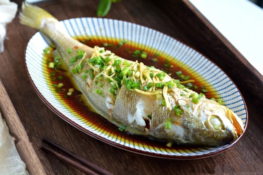 Cá đù vàng hấp xì dầu – thịt cá mềm ngọt, thấm vị mặn mà, ăn kèm cơm trắng thì ngon khó cưỡng.