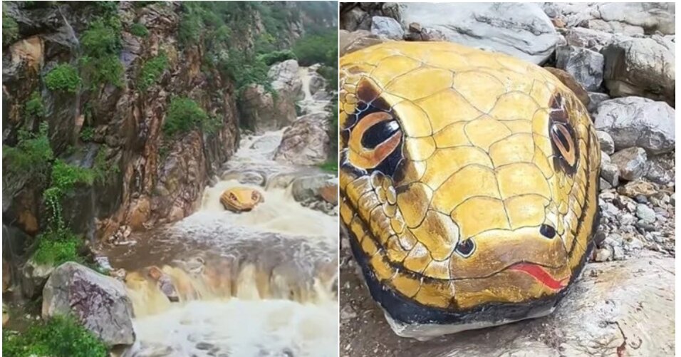 Mới đây, mạng xã hội Trung Quốc lan truyền hình ảnh "đầu trăn" khổng lồ xuất hiện giữa dòng suối trong khu thắng cảnh Ngọc Hoàng Câu trên núi Tùng Sơn (tỉnh Hà Nam).