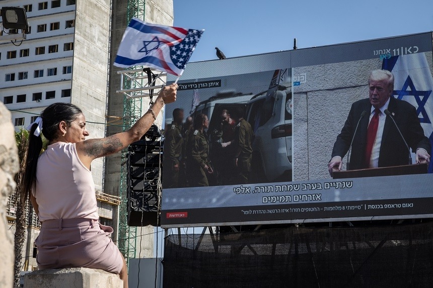 Người dân vẫy cờ khi xem Tổng thống Mỹ Donald Trump phát biểu tại Quốc hội Israel qua màn hình khổng lồ tại Quảng trường Hostages ở Tel Aviv, Israel. Ảnh: Getty