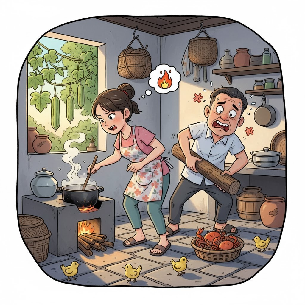 Một hôm, vợ đi chợ, chỉ còn cô em đang lom khom dưới bếp. Anh rể vác một khúc củi, len lén tiến lại gần sau lưng em vợ.