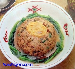 - Hột vịt muối lột vỏ – trộn thịt xay với tất cả các gia vị. Lấy 1 cái chén lớn đặt hột vịt muối vào chính giữa rồi cho thịt xay vào ( nhấn chặt thịt vào chén) Đem hấp khoảng 20 phút, là chín.