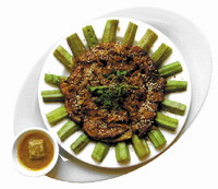 : Xếp bàn mai tím ra dĩa, ăn kèm muối tiêu chanh + rau răm.