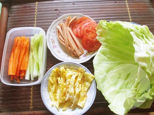 - Dưa chuột, cà rốt rửa sạch và gọt vỏ sau đó thái sợi cùng xúc xích hoặc giò lụa.