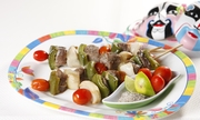Xiên vào que xen kẽ thịt bò, hành lá, hành tây, cà chua bi, ớt chuông.