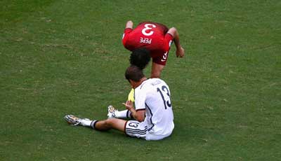 Cầu thủ áo đỏ số 5 Coentrao bị đốn ngã phải khiêng ra ngoài. Trọng tài thổi phạt Đức. Số 19 Almeida vào.
