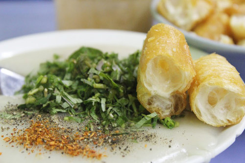Chủ quán chuẩn bị thêm rất nhiều quẩy đã được cắt miếng để ăn cùng cháo trai. Khi múc cháo, bác liền cho thêm húng thơm gồm hành khô và rau răm cắt nhỏ.