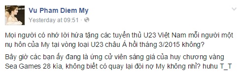 “Mọi người có nhớ lời hứa tặng các tuyển thủ U23 Việt Nam mỗi người một nụ hôn của My tại vòng loại U23 châu Á hồi tháng 3/2015 không?
