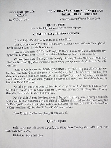 Trước diễn biến này, ngày 4-11, Sở Y tế tỉnh Phú Yên họp hội đồng kỷ luật để xem xét trường hợp của bác sĩ Sâm. Tại cuộc họp, 5/5 thành viên hội đồng bỏ phiếu kỷ luật bác sĩ Sâm bằng hình thức buộc thôi việc. Ngày 5-11, Sở Y tế ra quyết định buộc thôi việc đối với bác sĩ Sâm. Trong quyết định, Sở Y tế nêu lý do kỷ luật là do bác sĩ Sâm “không chấp hành sự phân công của lãnh đạo sở và tự ý nghỉ việc từ ngày 17-8 đến 4-11”.