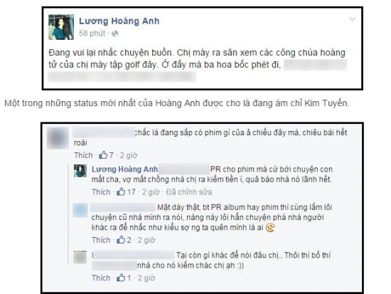 Sáng qua 12/1, Kim Tuyến bị vợ cũ của nam diễn viên Huy Khánh dằn mặt trên trang cá nhân bằng nhiều lời lẽ khá nặng nề. Thậm chí Hoàng Anh còn cho rằng Kim Tuyến đang lợi dụng scandal để quảng bá cho hình ảnh của bản thân. Chuyện xảy ra khá ồn ào trong dư luận khi Kim Tuyến chia sẻ về những ồn ào phá vỡ hạnh phúc gia đình Huy Khánh trên trang cá nhân.