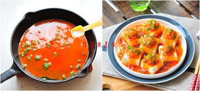Bắc chảo lên bếp cùng dầu ăn, cho hành lá thái nhuyễn vào đảo vài lần rồi cho nước sốt cà chua vào, thêm chút muối, hỗn hợp sôi lăn tăn thì đun 1 phút nữa là được. Đậu phụ hấp thịt chín thì trình bày ra dĩa, rưới nước sốt lên và thưởng thức.