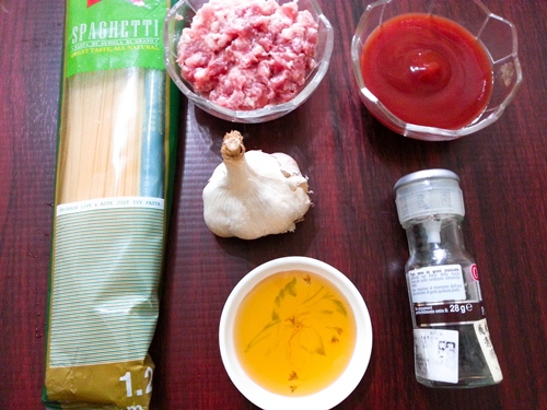 Bước 3: Bắc chảo lên bếp cho 1 xíu dầu ăn và cho tỏi vào phi cho thơm sau đó cho thịt vào xào, dùng thìa dằm thịt cho tơi ra xào cho thịt chín thì cho nước sốt cà chua vào đảo đều, nêm lại xem gia vị vừa ăn chưa thì tắt bếp.
