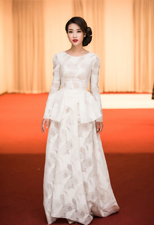 Tham dự đêm bế mạc Tuần lễ thời trang quốc tế Việt Nam Thu đông 2016, Hoa hậu Đỗ Mỹ Linh hóa tiểu thư dịu dàng trong bộ đầm trắng nữ tính.