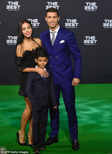 Cô người mẫu 21 tuổi không ngại sánh bước bên bạn trai và cậu con trai Ronaldo Junior. Chiếc váy đen sang trọng khoe được đường cong quyến rũ và sự tươi trẻ của Georgina.