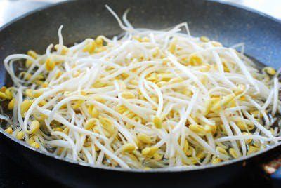 Cho giá đỗ và nước sốt còn lại vào chảo miến. Rồi nhanh tay đảo đều lên cho các nguyên liệu hòa quyện vào nhau.