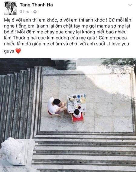 Trên trang cá nhân, Tăng Thanh Hà chia sẻ những ngày tháng bận rộn khi cùng lúc chăm sóc hai con nhỏ và sự áy náy khi phải san sẻ tình cảm dành cho hai bé.