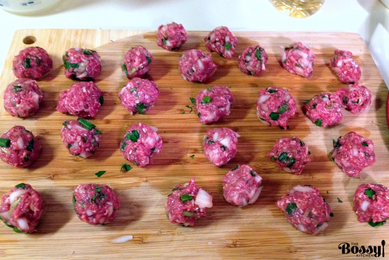 - Trộn đều thịt xay, hành tây, trứng, mùi tây, muối và tiêu, sau đó nặn thành từng viên thịt nhỏ.