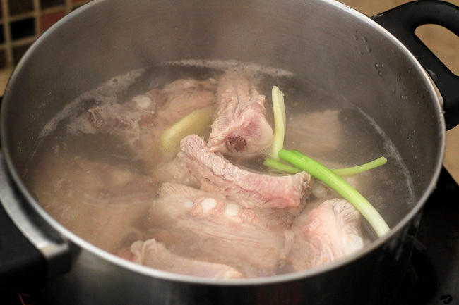 - Bỏ sườn vào nồi nước sạch, thêm hành lá, muối và gừng, đun sôi trong khoảng 15 phút hoặc cho đến khi thấy sườn đã hơi nhừ. Tắt bếp, vớt sườn ra.