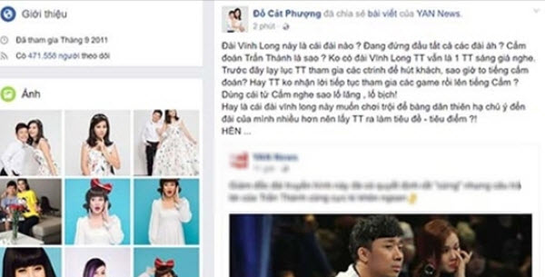 Nguyên văn status của Cát Phượng như sau: “Đài Vĩnh Long này là cái đài nào? Đang đứng đầu tất cả các đài à? Cấm đoán Trấn Thành là sao? Không có đài Vĩnh Long Trấn Thành vẫn là 1 Trấn Thành sáng giá nghe. Trước đây lạy lục Trấn Thành tham gia các chương trình để hút khách, sao giờ to tiếng cấm đoán? Hay Trấn Thành không nhận lời tiếp tục tham gia các game rồi lên tiếng cấm? Dùng cái từ cấm nghe sao lố lăng, lố bịch! Hay là cái đài Vĩnh Long này muốn chơi trội để bàn dân thiên hạ chú ý đến đài của mình nhiều hơn nên lấy Trấn Thành ra làm tiêu đề – tiêu điểm ?!