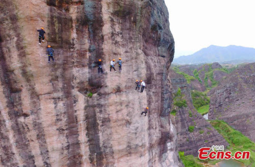 Du khách mạo hiểm di chuyển trên vách đá dựng đứng.