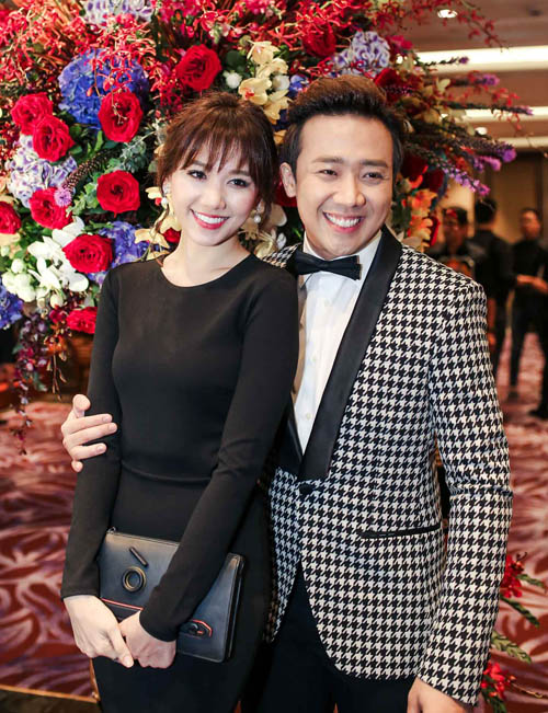 Trong buổi tiệc, sự xuất hiện của vợ chồng Trấn Thành - Hari Won cũng thu hút sự chú ý của cư dân mạng. Trấn Thành diện vest caro trẻ trung còn bà xã Hari Won diện đầm đen ôm sát khoe trọn đường cong của cơ thể.