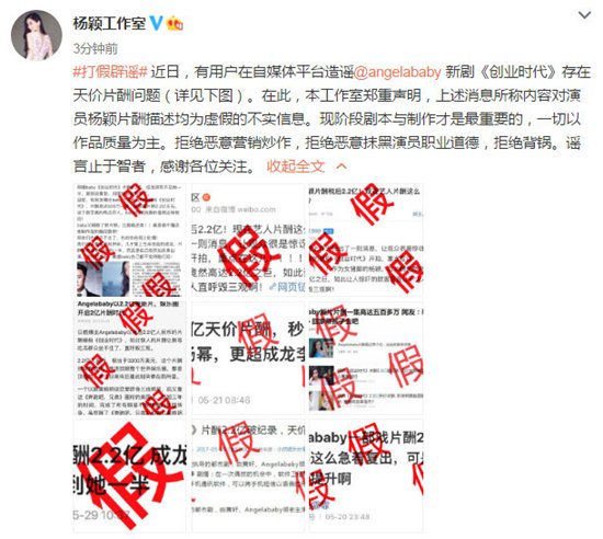 Những lùm xùm về cát-xê kỷ lục của bà xã Huỳnh Hiểu Minh khiến nữ diễn viên 28 tuổi hứng chịu không ít búa rìu dư luận. Phía Angela Baby cuối cùng đã chính thức công khai sự thật. Theo đó, đại diện Angela Baby phủ định tin đồn về con số 220 triệu NDT mà cô được trả khi tham gia Thời đại lập nghiệp.