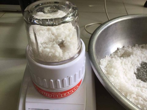 - Bước 2: Đổ theo thứ tự các loại nguyên liệu vào cối xay để xay nhuyễn. Đầu tiên đó là xay muối hạt (chú ý không xay thành bột, chỉ xay khi muối còn hạt nhỏ).