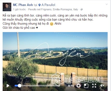 Mới đây, MC Phan Anh cũng viết status đầy ẩn ý để đáp trả những người ghét và khó chịu với anh: “Kể ra bạn càng tỉnh bơ, càng mỉm cười, càng an yên mà bước tiếp thì những kẻ muốn khuấy động cuộc sống của bạn càng khó chịu và hằn học. Cũng thấy thương nhưng kệ họ đi”.