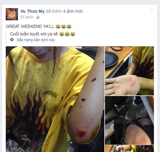 Cách đây vài giờ, Quán quân Giọng hát Việt 2013 - Vũ Thảo My chia sẻ dòng trạng thái với tiêu đề "Great weekend" kèm theo hình ảnh toàn thân trầy xát, rớm máu. Trong ảnh, khuỷu tay trái, lòng bàn tay và hai đầu gối của Thảo My trầy xước, rớm máu. Loạt ảnh này khiến người hâm mộ vô cùng lo lắng.