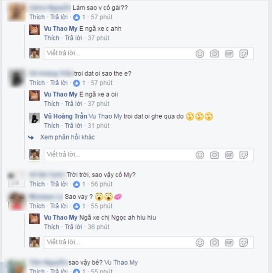 Ngay sau đó, Vũ Thảo My gửi lời cảm ơn tới bạn bè, người thân và nhắn nhủ rằng tinh thần, sức khỏe vẫn ổn định. Cô nàng cũng chia sẻ nguyên nhân khiến mình gặp tai nạn: "Mọi người ơi em mới ngã xe đo đường 1 phát ngay trước mặt nhà thờ Đức Bà mà cả thành phố này đã nhìn thấy mọi người à. Cái ô tô đằng trước quẹo mà xi nhan trễ nên em bị thắng gấp xong nguyên người nguyên xe đổ cái rầm. Quê thực sự quê. Cảm ơn các anh chị em đã hỏi thăm, e ổn".