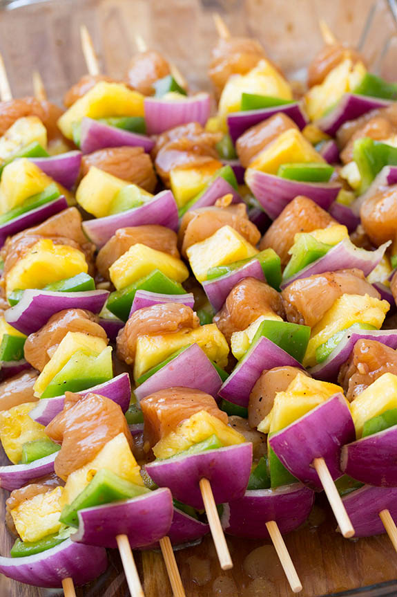 - Lấy gà khỏi tủ lạnh. Xiên hành tím, ớt chuông, dứa và thịt gà vào que, lần lượt tới khi hết.