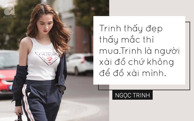Ngọc Trinh từng nói: "Trinh ngu nhưng Trinh giỏi kiếm tiền". Đúng là Trinh giỏi thật, vừa giỏi kiếm tiền vừa giỏi tiêu tiền, cứ nh́n tủ đồ hiệu của cô là biết ngay cô mê đồ hiệu thế nào, đầu tư chúng ra làm sao, và thu nhập cũng phải "khủng" thế nào th́ mới vung tay được như vậy chứ. Nói về Ngọc Trinh, nhất là về sở thích hàng hiệu của cô, nói hoài nói măi cũng không hết cái để nói. Hết liệt kê đồ hiệu, rồi soi giá tiền lại đến những phát ngôn ngắn gọn súc tích nhưng đúng chất phô trương khiến cả Vbiz phải dậy sóng.