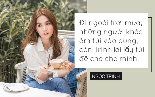 Ngọc Trinh nổi tiếng với câu Không có tiền th́ cạp đất mà ăn. Sau chia tay tỷ phú Việt kiều, cô nàng có những phát ngôn triết lư hơn. Bên cạnh đó, người đẹp cũng có những phát ngôn đầy bản lĩnh về hàng hiệu.