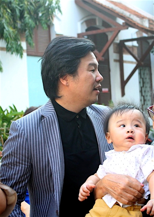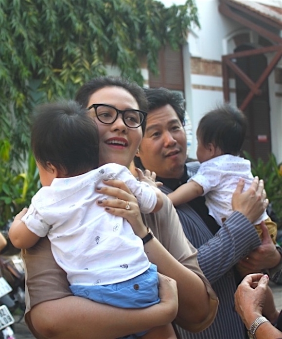 Cặp song sinh của Thanh Bùi chưa quen với đám đông nên khóc nhiều. Vợ của Thanh Bùi phải bế con vào trong dỗ dành